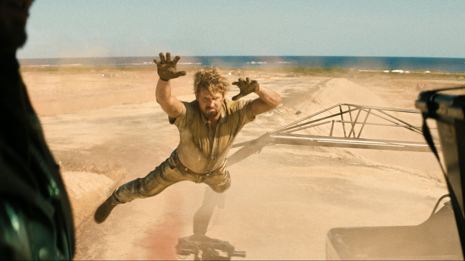 実際にビーチでの車の横転シーン、